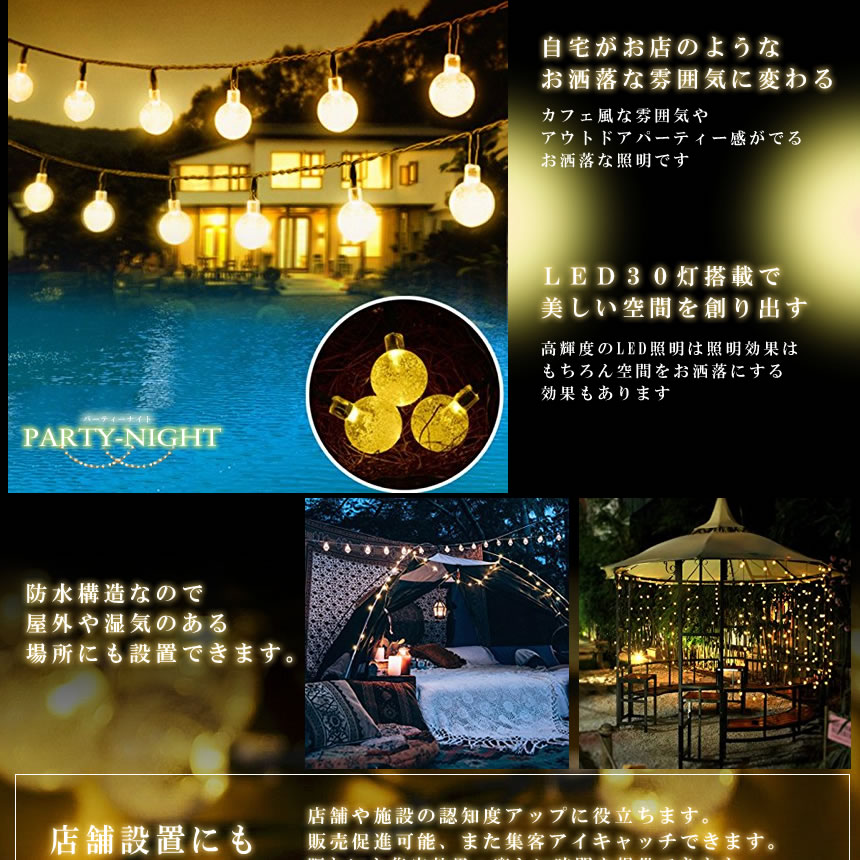 ソーラーパネル搭載で配線不要の 防水仕様の高輝度LED搭載ガーデンライト 30灯のガーデンイルミネーションLEDライト「パーティーナイト」が登場!!! 様々な機能を搭載しています ・太陽光パネル搭載で配線不要・防水仕様で屋外でも使える ・大量30灯のLEDを搭載・点灯&点滅の2つのモード 6mケーブルで迫力抜群!自宅の庭やウッドデッキが超お洒落に 自宅がお店のようなお洒落な雰囲気に変わる カフェ風な雰囲気やアウトドアパーティー感がでるお洒落な照明です LED30灯搭載で美しい空間を創り出す ソーラーパネル搭載で昼間に充電して夜間に自動点灯します。
