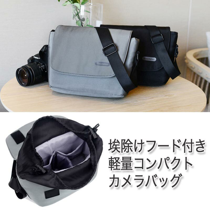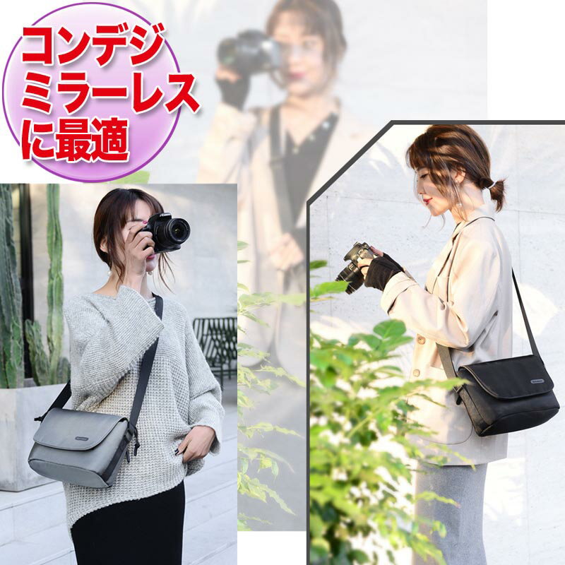 キャノン ニコン オリンパス ソニー ミノルタ EOS canon nikon olympus sony pen kissシンプル軽量、コンデジやミラーレス一眼レフに最適なカメラバッグ 【旅行お出かけに最適、ミラーレス一眼カメラとアクセサリーを安全に持ち運べるコンパクトなカメラバッグ】■シンプルなデザイン・必要最低限の機材を持ってお出かけするのに最適サイズ、おしゃれさと機能性を追求したカメラバック■フラップは開け閉めしやすいマジックテープ仕様・幅広のベルクロテープ(マジックテープ)での開け閉めはフタを軽く締めるだけでOK、マグネットのように場所を合わせる必要はありません■マチ12cmの薄型設計でかさばらない・マチ12cm幅23cm(底部分)高さ18cmでミラーレス一眼やコンパクトデジタルカメラを効率よく収納できるようデザイン■ほこりよけフード付き・巾着タイプのほこりよけカバーが内蔵されていて大切な機材をほこりやごみから守ります。